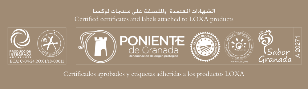 ويحمل لوكسا شهادات DOP Poniente de Granada و Sabor Granada وختم الجودة الأوروبي، مما يعكس أصالة المنشأ واعتماد الجودة العالية. كما يتميز باعتماد الإنتاج المتكامل في الأندلس وشهادة الجودة المُعتمدة، التي تضمن زراعة نظيفة وجودة رسمية موثّقة.